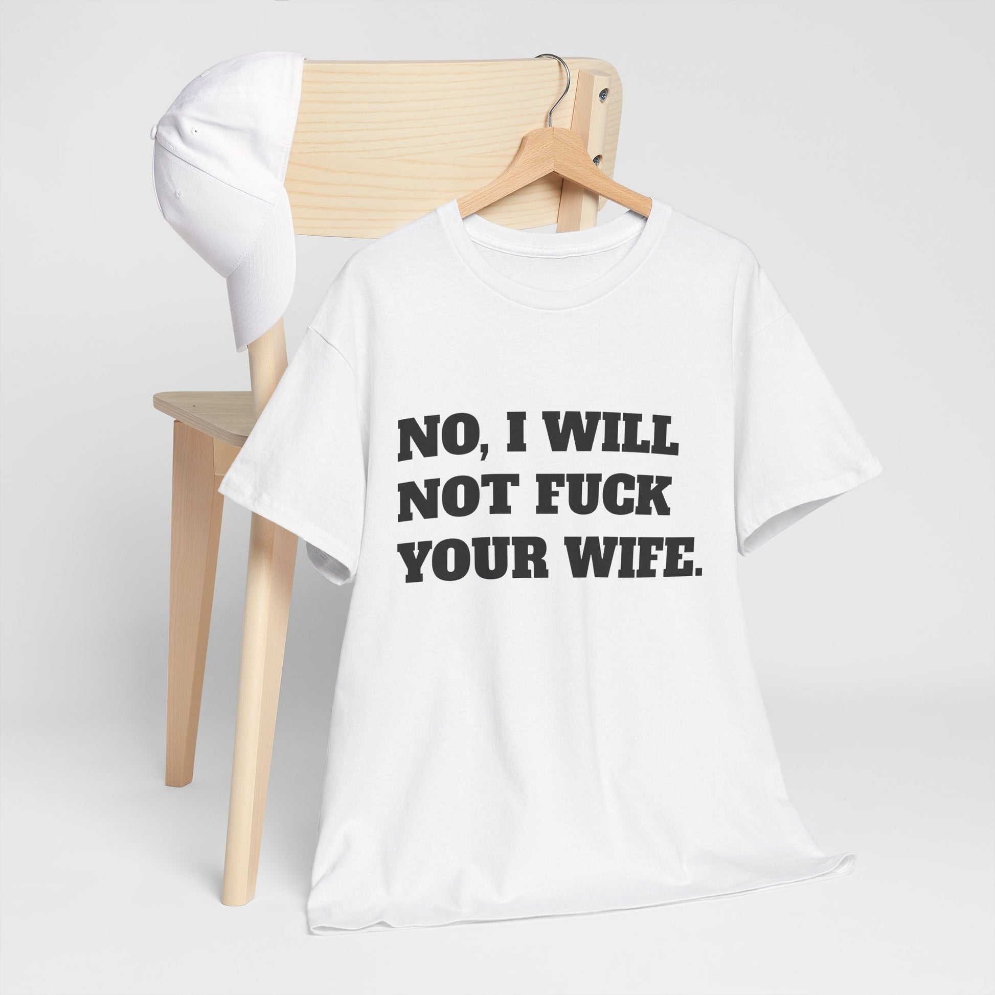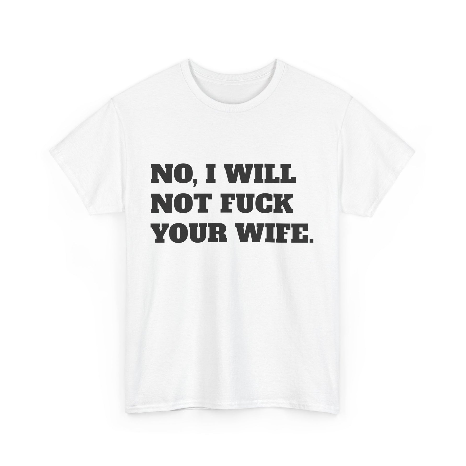 A bold and straightforward T-Shirt featuring the message 'no i will not fuck your wife'. Perfect for those who appreciate edgy humor and want to make a statement. Ideal for casual wear and as a conversation starter. Relevant for occasions like bachelor parties or unconventional gatherings.